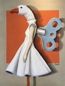 2020Miss Gullina uit de Miss reeks, half vrouw, half dier acrylverf op MDF paneel, inclusief lichtgrijze houten baklijst 80x60cm