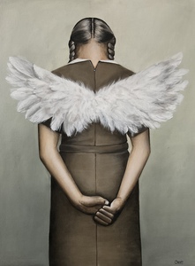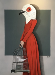 2020Het meisje met de duif acrylverf op MFD paneel 80x60cm inclusief houten baklijst