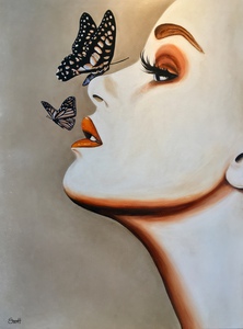 2020Miss Chica ui de Miss reeks, half vrouw half dier acrylverf op MDF paneel 80x60cm inclusief beige houten baklijst